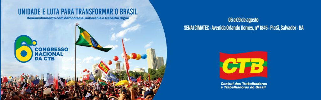 Começa nesta quarta-feira (6 de agosto), em Salvador (BA), o 6º Congresso Nacional da Central dos Trabalhadores e Trabalhadoras do Brasil (CTB). O evento será realizado até sábado (9/8) e reunirá delegados, delegadas e observadores(as) de todo o país para debater os rumos do movimento sindical e aprovar as resoluções políticas e organizativas da central. A expectativa da CTB é também reunir convidados internacionais na perspectiva de fortalecer um projeto de sindicalismo classista e independente de governos e patrões — veja a programação completa, ao final desta postagem.