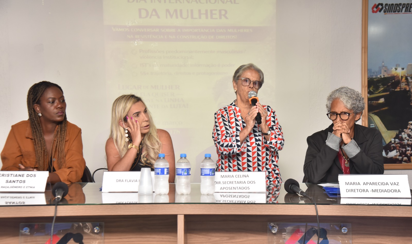 As diretoras do Sindsprev/RJ, Marcia Aparecida Vaz, da Secretaria de Políticas Sociais; Maria Celina e Marta Meirelles, da Secretaria de Aposentados e Terceira Idade (organizadora do evento); e Cristiane dos Santos, da Secretaria de Gênero, Raça e Etnia, participaram da abertura do debate. A segunda palestra será após o almoço. Marly Ferreira Pereira, do Centro Municipal de Saúde Flávio do Couto Vieira, vai falar sobre doenças sexualmente transmissíveis. Em seguida, Isabel Monteiro, presidente do Instituto de Promoção e Defesa dos Direitos Humanos Carolina de Jesus, fará palestra a respeito do tema “Mulheres 55+, trajetória direito e protagonismo”.
