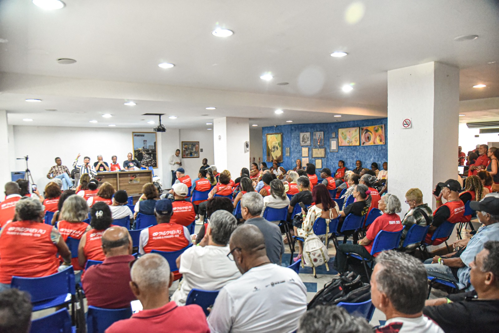 Nas primeiras falas, foram apresentados informes sobre recentes lutas, pautas e mobilizações dos setores que compõem a base do Sindsprev-RJ.