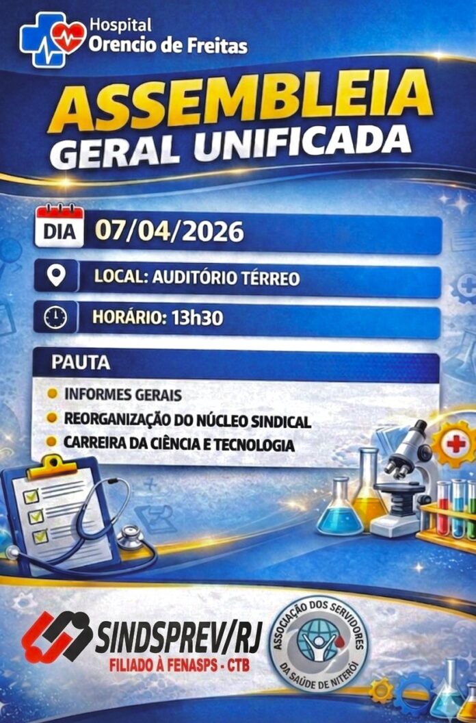 Os servidores da saúde do Hospital Orencio de Freitas, em Niterói, têm assembleia geral unificada no dia 7 de abril, terça-feira, às 13h30. O encontro acontece no auditório térreo. A assembleia é uma convocação do Sindsprev/RJ em conjunto com a Associação dos Servidores da Saúde de Niterói.