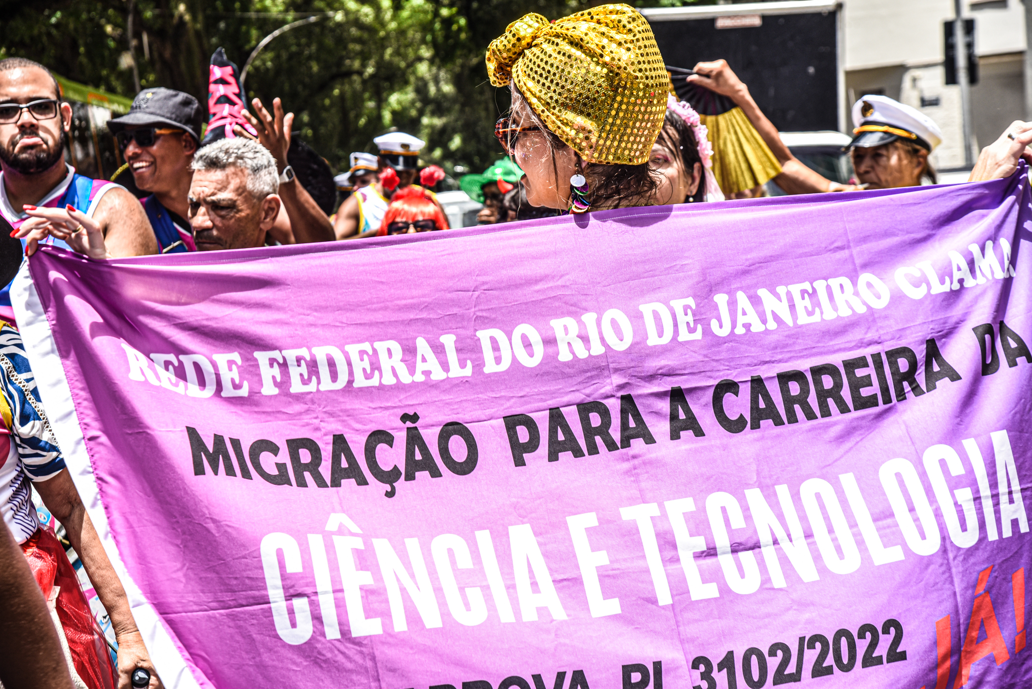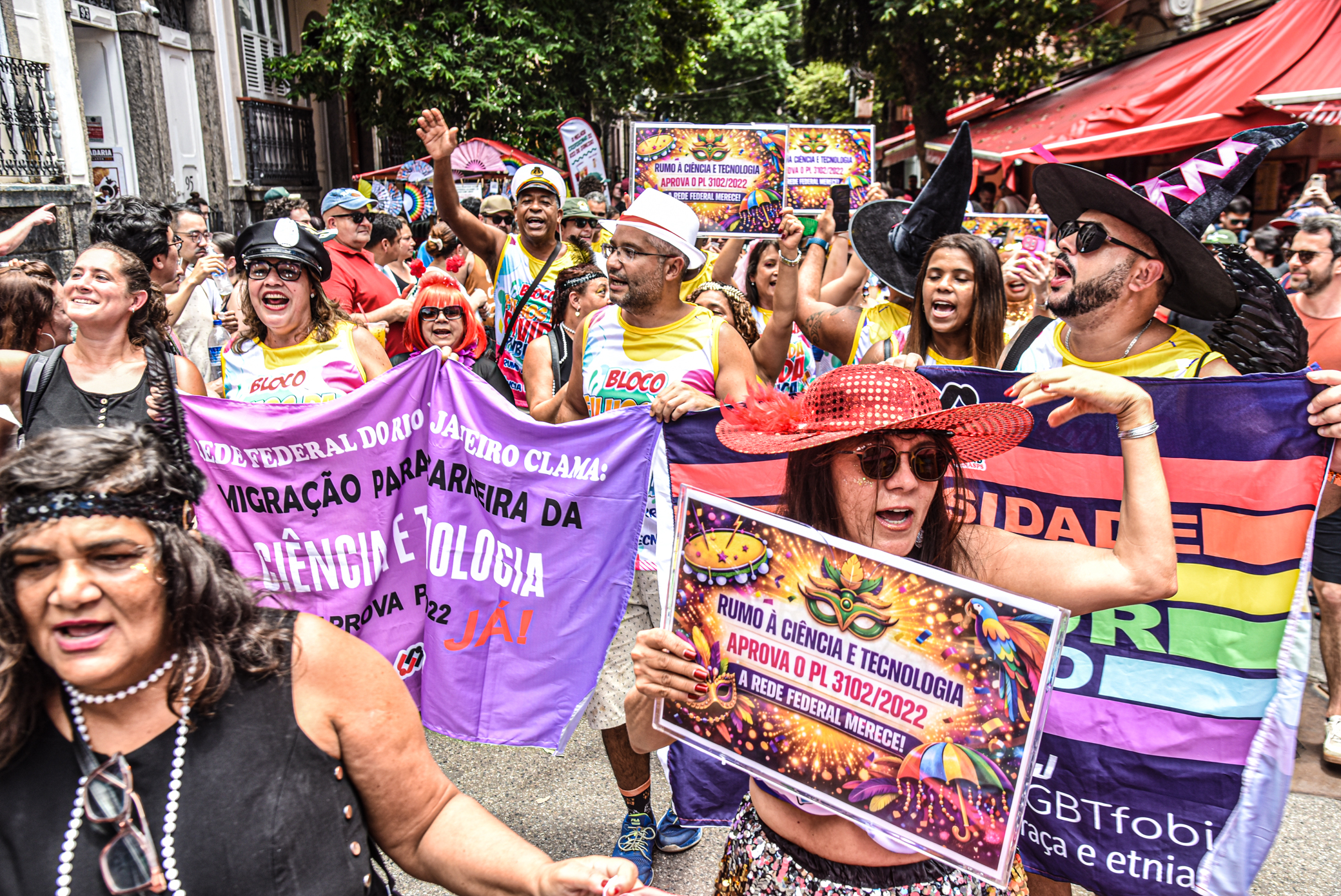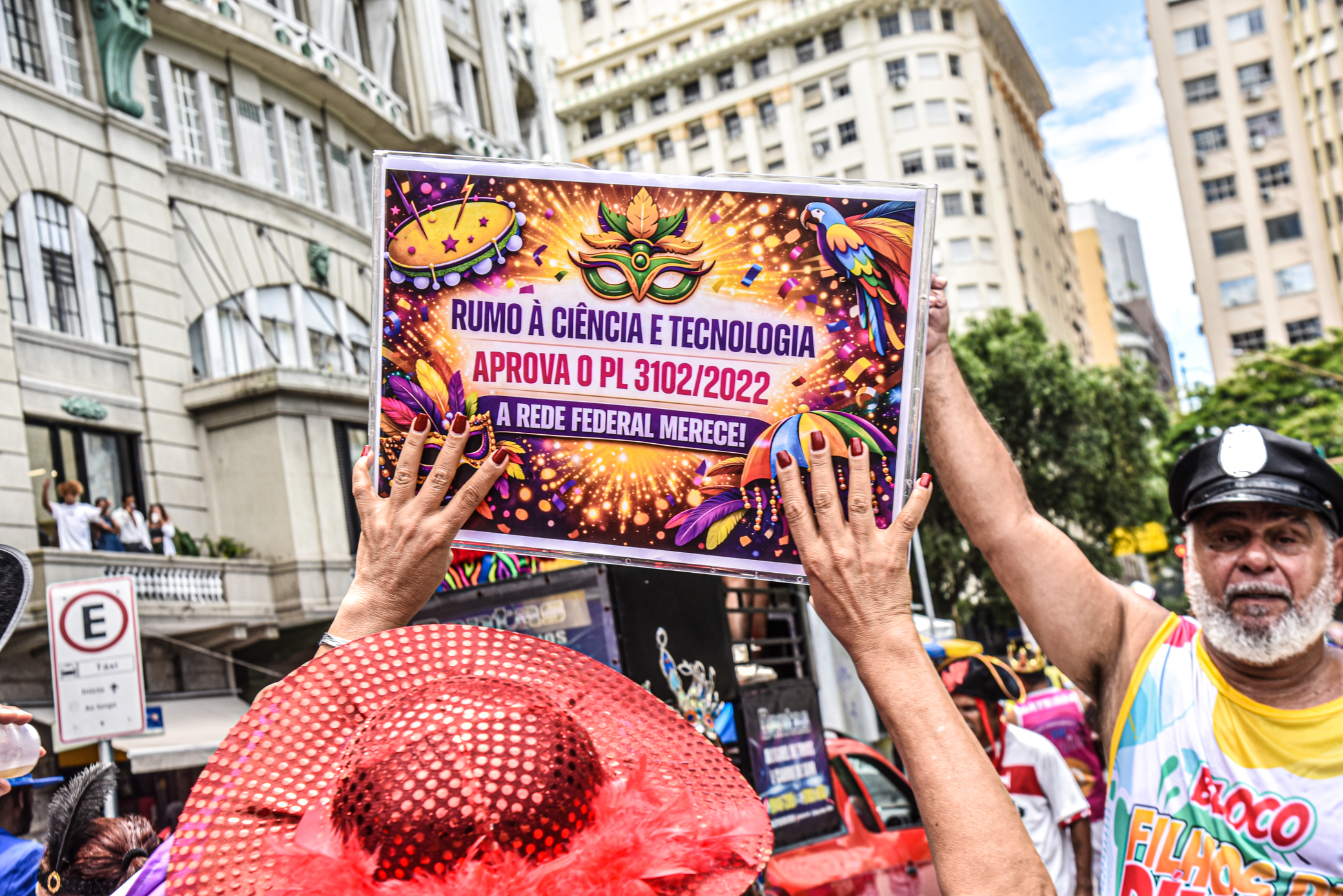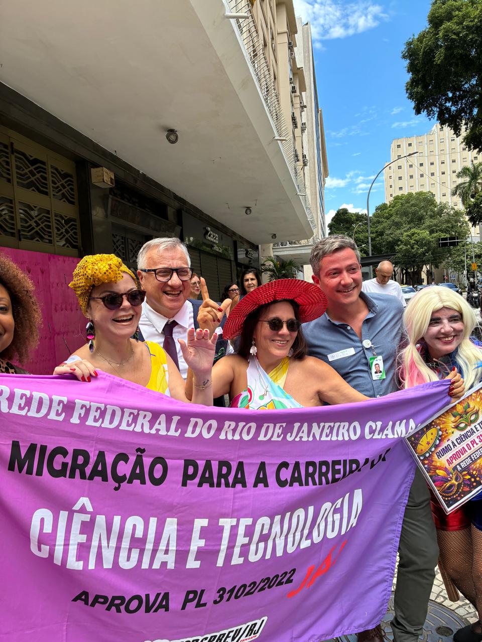 Com sambas tradicionais do maior carnaval do mundo, o bloco teve à frente a Bateria da Escola de Samba Furiosa da Costa Verde, e as rainhas da bateria, Áquila e Alessandra, além do mestre-sala Julinho. Faixas e cartazes coloridos davam o recado do enredo deste ano: “Rumo à Carreira da Ciência e Tecnologia – Não aceitaremos menos que isso!”. A diretora de Imprensa do Sindicato, Maria Isabel, lembrou que o PL foi aprovado na Câmara dos Deputados, e seguiu para o Senado, onde o Sindsprev/RJ articula a sua passagem por no máximo duas comissões, uma delas em caráter terminativo, para que não seja necessário ir ao plenário.