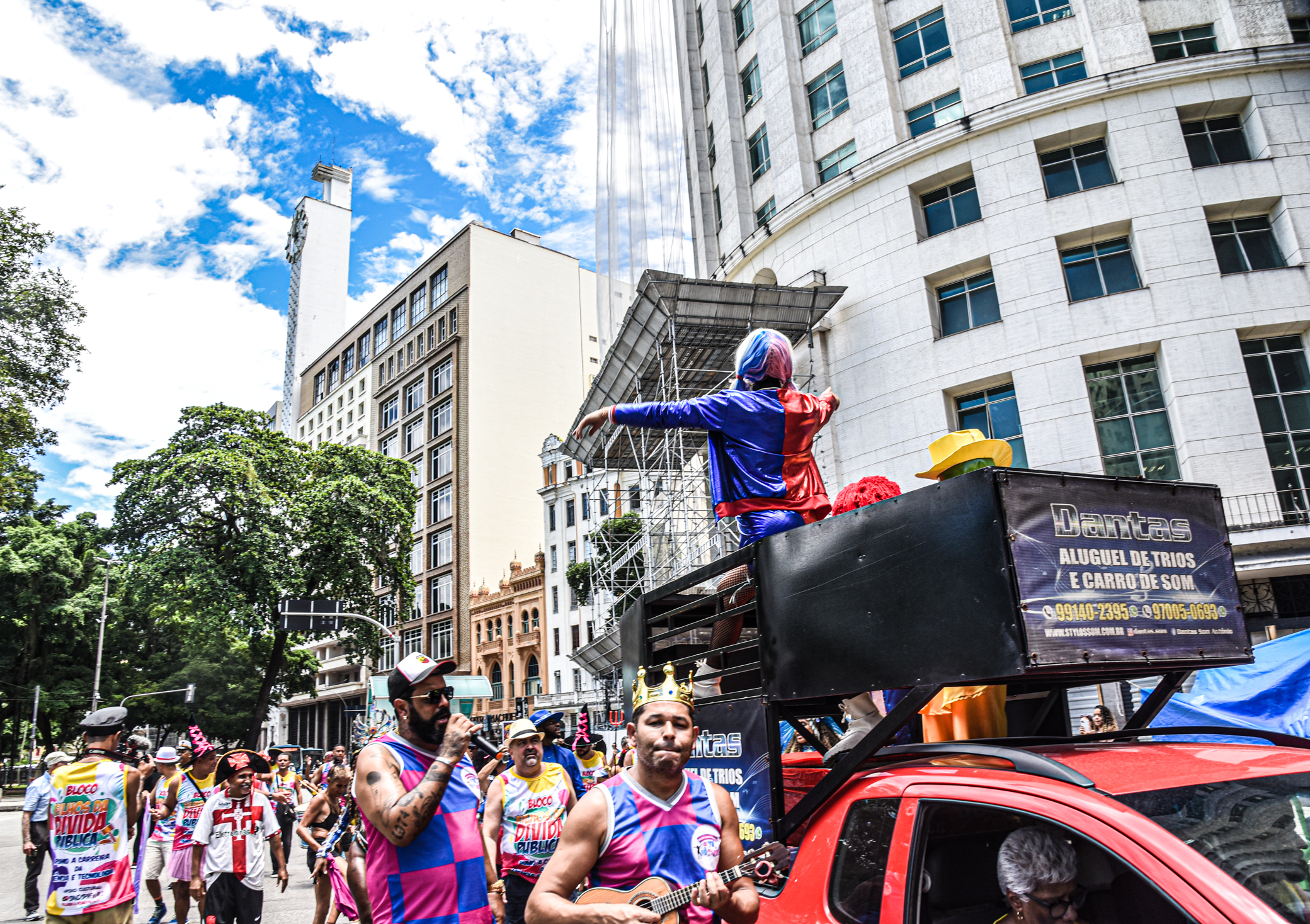 Folia do Bloco enlouqueceu o Centro da Cidade – O Filhos da Dívida Pública saiu da sede do Sindsprev/RJ às 10h30, passando pela Rua da Lapa, Augusto Severo, Rio Branco, chegando até o prédio do Departamento de Gestão Hospitalar (DGH), representação do Ministério da Saúde no Rio de Janeiro, na Rua México, 128, onde houve a dispersão, às 12h12. Além de faixas em defesa da migração para a C&T, outras defendiam o fim da LGBTFobia, de qualquer tipo de discriminação, colocando no lugar o amor e a paz. Os foliões – diretores do Sindicato, ativistas, além de pessoas da população e turistas que aderiram ao bloco – se esbaldavam na pele de coelhinhas, piratas, almirantes, mexicanos, reis, rainhas e Arlequinas.