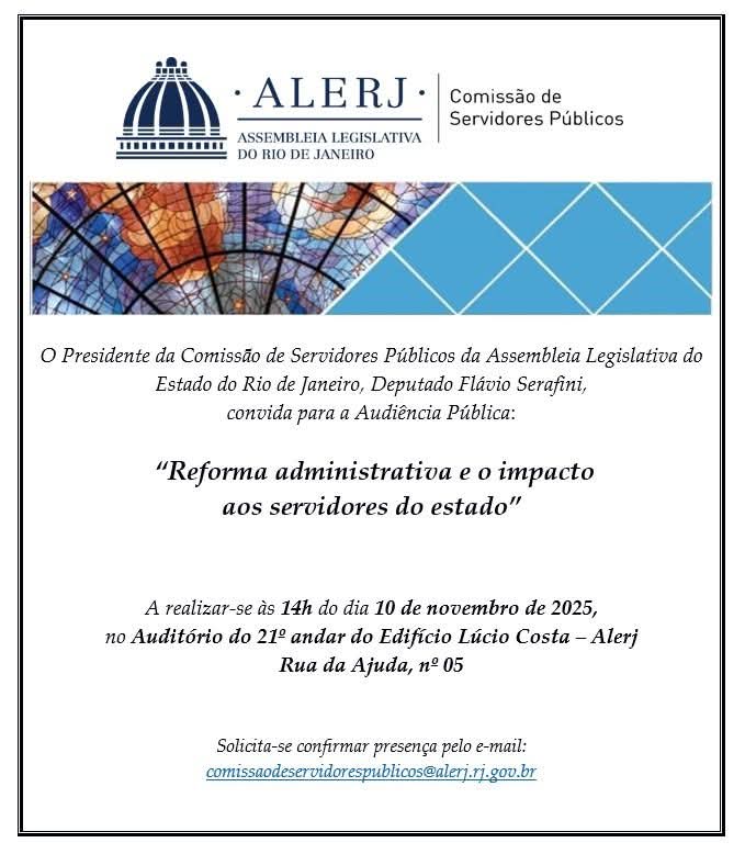 “Reforma administrativa e os impactos sobre os servidores do estado”. Este é o tema central da audiência pública, no dia 10 de novembro, no novo prédio da Assembleia Legislativa (Alerj), às 14 horas. Diversas entidades da sociedade, inclusive do movimento sindical, estarão participando. A audiência foi convocada pelo presidente da Comissão de Servidores Públicos da Alerj, o deputado Flávio Serafine (PSOL-RJH). A Alerj fica no Edifício Lúcio Costa, na Rua da Ajuda, 5, 21º andar.