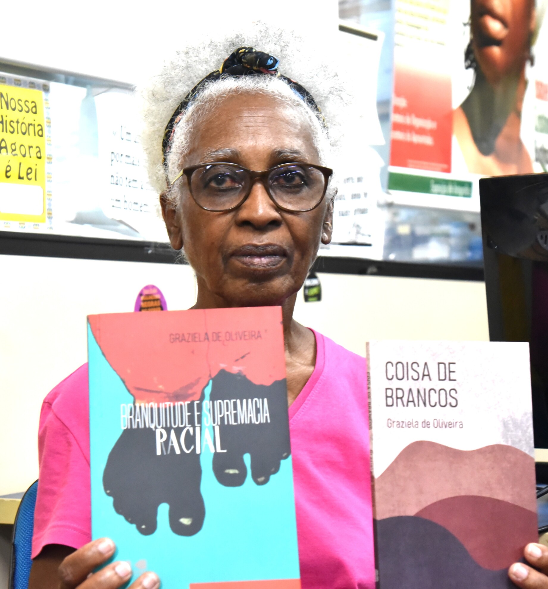 Graziela exibe livros que serão novamente lançados dia 29/8, no Sindsprev-RJ. Foto: Magá.