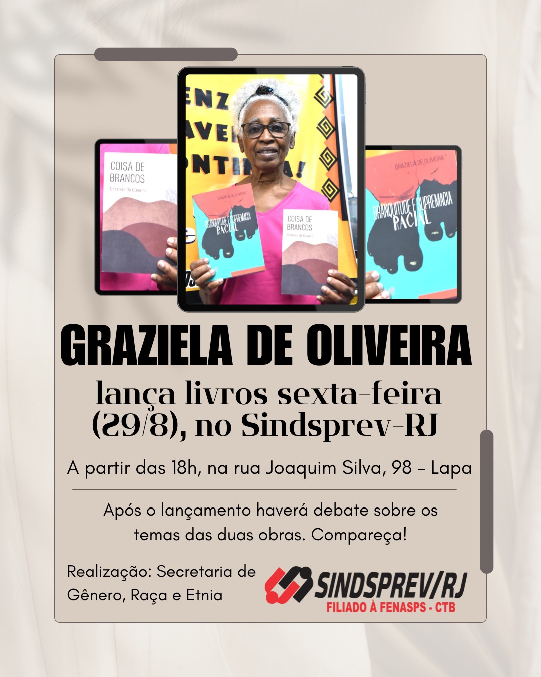 A Secretaria de Gênero, Raça e Etnia do Sindsprev-RJ convida os(as) servidores(as) da seguridade e do seguro social para mais um lançamento dos livros ‘Branquitude e Superioridade Racial’ e ‘Coisa de Brancos’, ambos de autoria da professora Graziela de Oliveira.