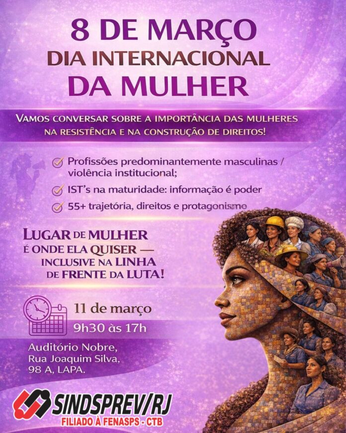 O Sindisprev/RJ realiza no próximo dia 11, quarta-feira, uma atividade em homenagem ao Dia Internacional da Mulher (8 de março). Palestras sobre diversos temas como violência de gênero, feminicídio, direitos e saúde da mulher para inspirar e fortalecer ainda mais a luta contra a opressão de gênero. O evento acontece no Auditório Nobre do Sindisprev/RJ (Rua Joaquim Silva, 98 A – Lapa).