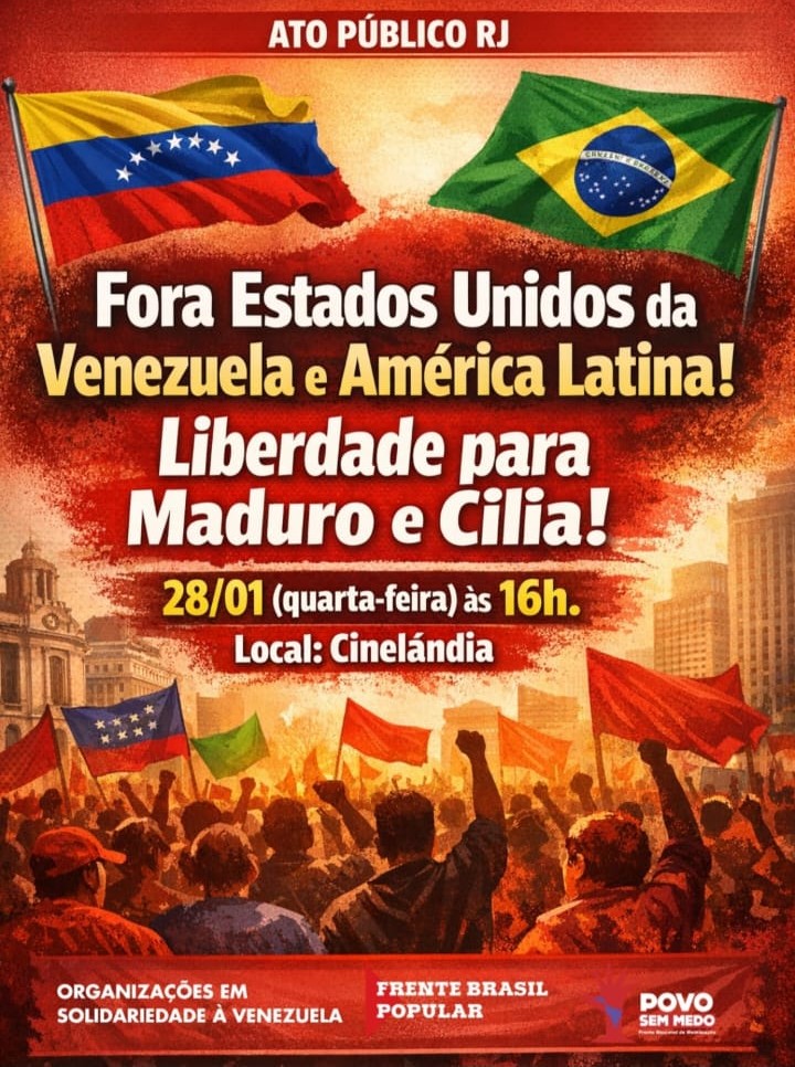 Nesta quarta-feira (28/1), às 16 horas, a Cinelândia será palco de um novo protesto contra o sequestro do presidente da Venezuela, Nicolás Maduro, pelas forças armadas dos Estados Unidos, na madrugada de 3 de janeiro deste ano. A manifestação vai exigir a liberação do venezuelano e de sua esposa Cília Flores, raptados para uma prisão estadunidense sob a alegação, depois desmentida pelo próprio governo Donald Trump, de chefiarem um cartel de narcotráfico.