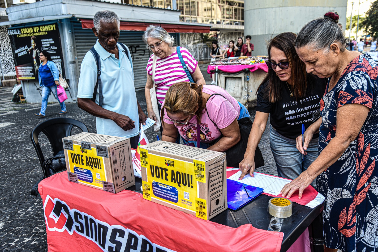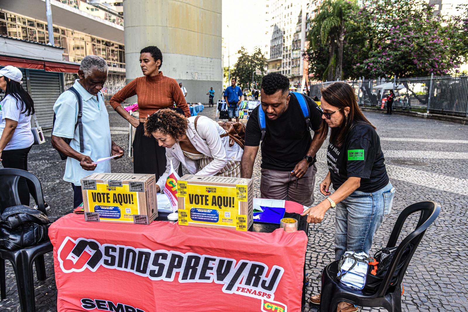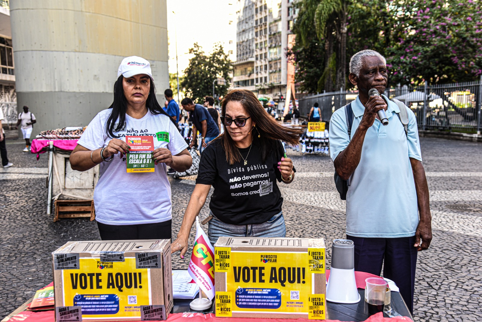 Nesta sexta-feira (18/7) a banquinha com urnas de votação e panfletos foi colocada no Largo da Carioca. Desta vez, o que chamou a atenção foi o interesse da maioria dos votantes em relação à proposta de extinção da jornada 6X1. Outros itens do plebiscito são a isenção do imposto de renda para salários até R$ 5 mil e redução até R$ 7 mil; e a taxação dos milionários que hoje não pagam nada.