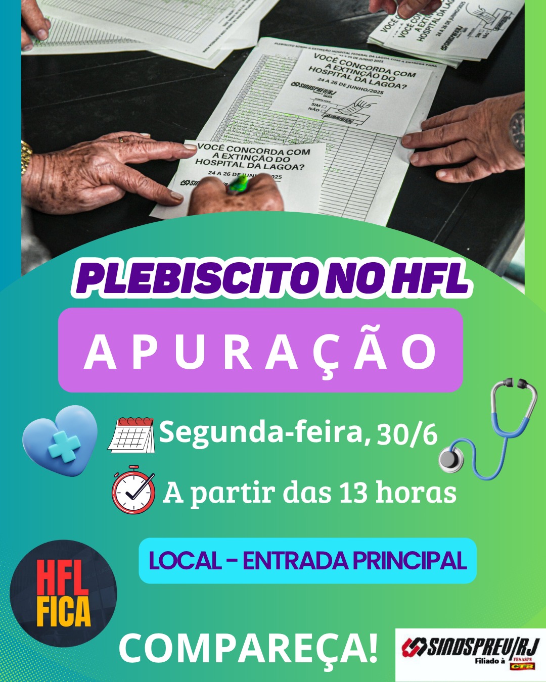 Será realizada na próxima segunda-feira (30 de junho) a apurados dos votos computados no plebiscito sobre a extinção do Hospital Federal da Lagoa (HFL). O início da contagem dos votos está previsto para as 13h, na entrada principal do HFL. Se você é servidor ou servidora do Hospital Federal da Lagoa, não deixe de comparecer à apuração.