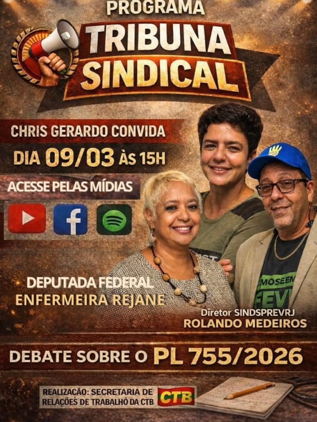 O programa Tribuna Sindical, produzido pela central sindical CTB, vai fazer sua estreia nesta segunda-feira (9/3), às 15 horas, pelas redes virtuais. O link de acesso ao programa pelo YouTube é https://youtube.com/live/W7hPPzqmNMA?feature=share. Para assistir, basta clicar em cima. Filiado à central, o Sindsprev/RJ vai exibir o Tribuna em suas mídias. Participam como convidados os diretores do Sindicato e da CTB, Rolando Medeiros e Christiane Gerardo, e a deputada federal Enfermeira Rejane (PCdoB-RJ).
