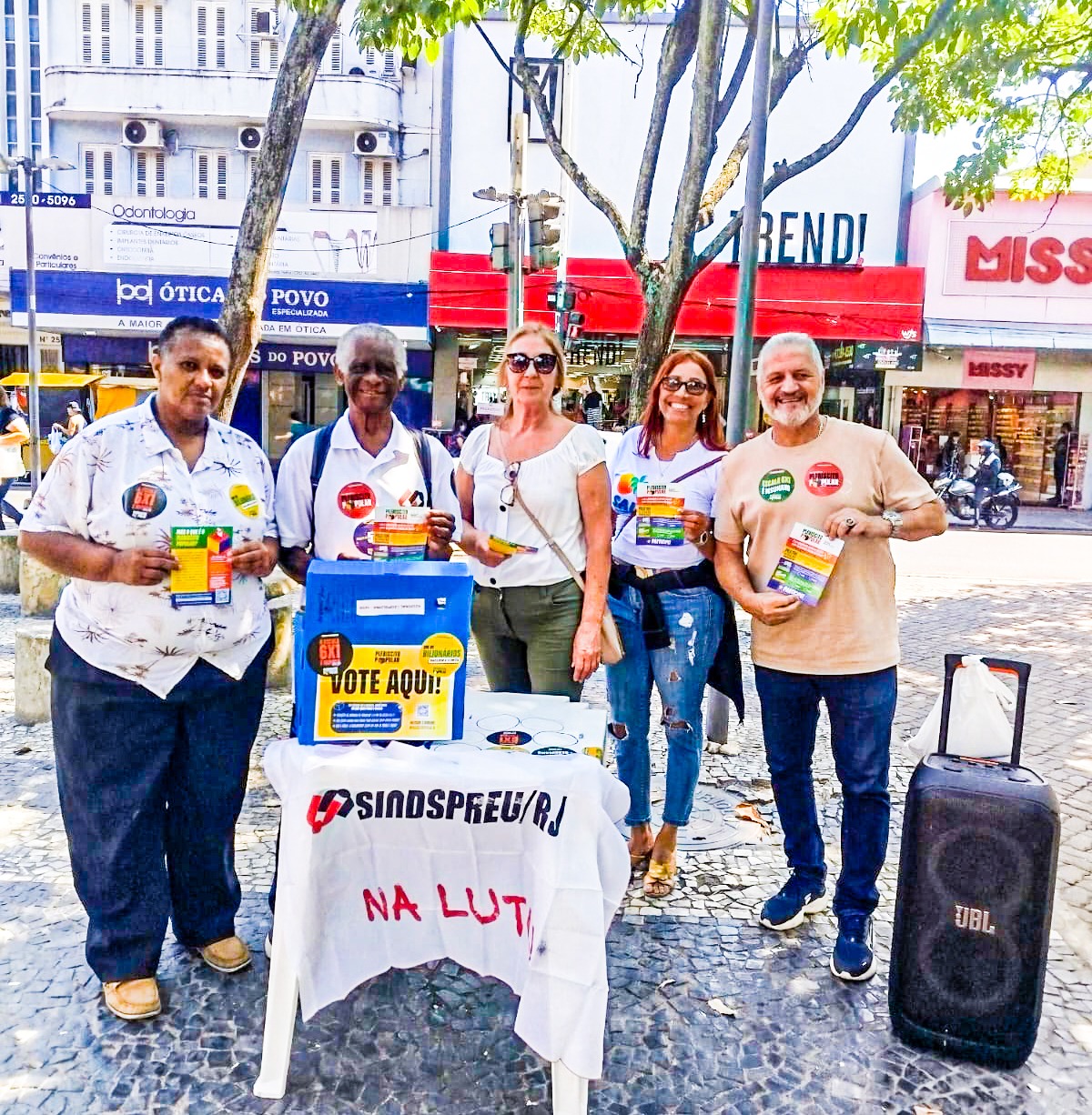 A Regional Leopoldina do Sindsprev-RJ realizou, na manhã de segunda-feira (18/8), sua coleta de votos para o Plebiscito Popular que está consultando os(as) brasileiros(as) sobre os seguintes temas: fim da escala de trabalho 6 X 1; isenção de Imposto de Renda para quem ganha até R$ 5 mil mensais; taxação de grandes fortunas; e definição dos serviços de saneamento como direito fundamental. A coleta de votos promovida pela Regional Leopoldina aconteceu em Bonsucesso, com participação de dirigentes e servidores da base do Sindsprev-RJ.