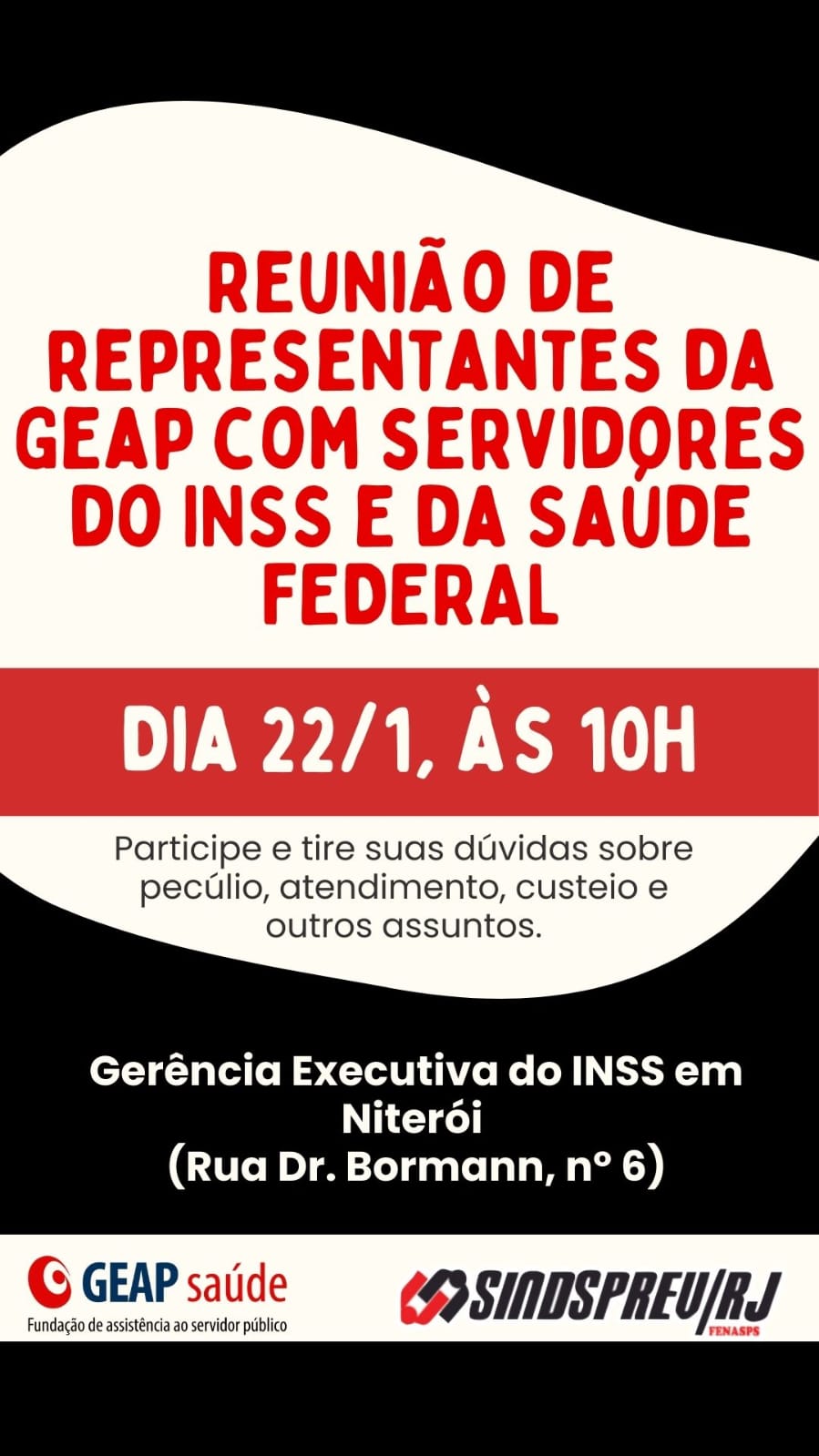 A Regional Niterói do Sindsprev-RJ convida os servidores da seguridade (saúde federal) e do seguro social (INSS) a participarem de reunião com representantes da Geap na próxima quinta-feira (22 de janeiro), a partir das 10h, na sede da Gerência Executiva do INSS (rua Dr. Bormann, nº 6). A reunião será uma excelente oportunidade para que os servidores tirem dúvidas sobre pecúlio, atendimento, custeio, funcionamento e planos oferecidos pela Geap.
