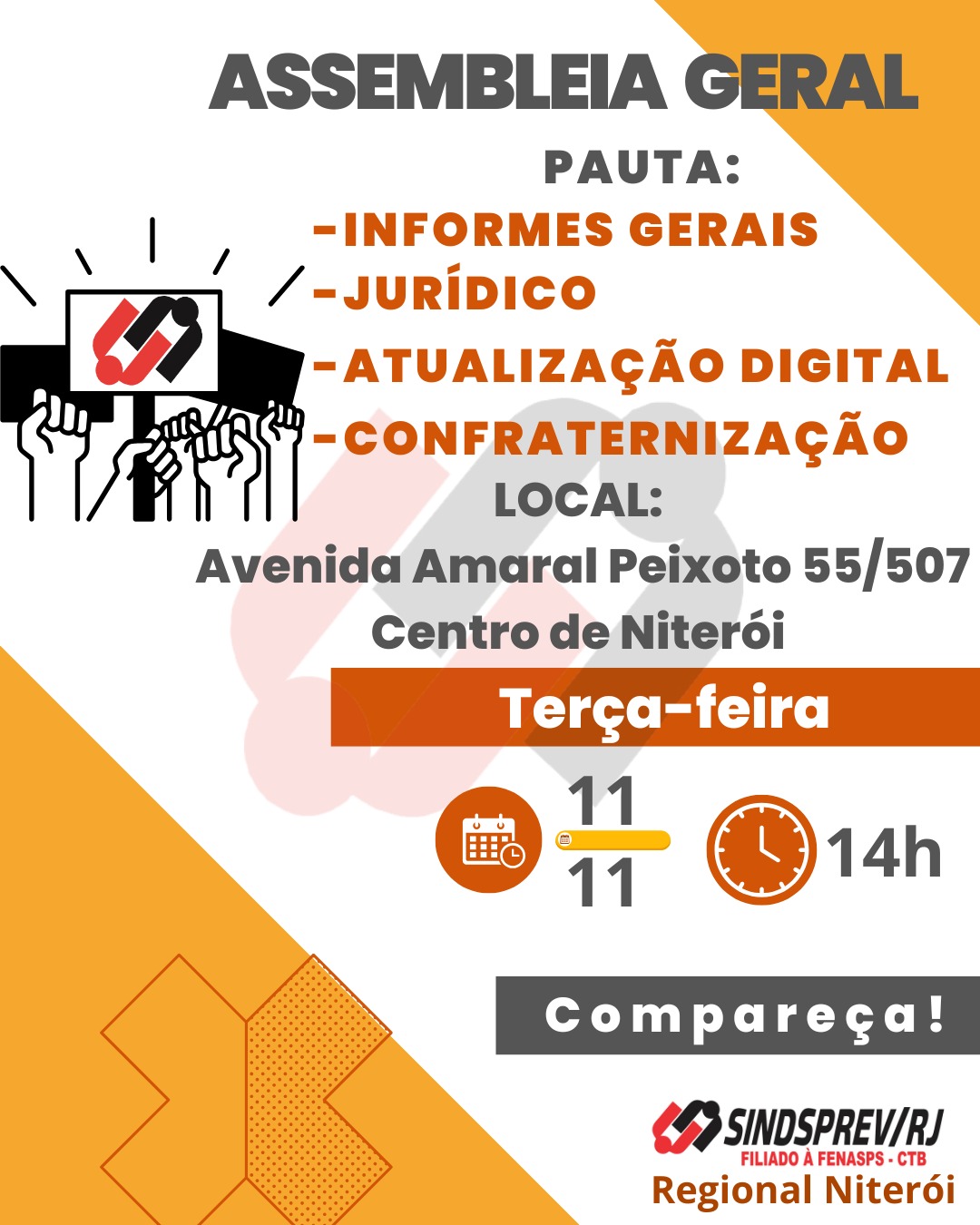 Servidores da seguridade e do seguro social em Niterói fazem assembleia geral no próximo dia 11 de novembro, a partir das 14h, na Av. Amaral Peixoto, 55 – sala 507 (Centro de Niterói). Na pauta: apresentação de informes gerais, informes jurídicos, atualização digital e confraternização dos servidores.