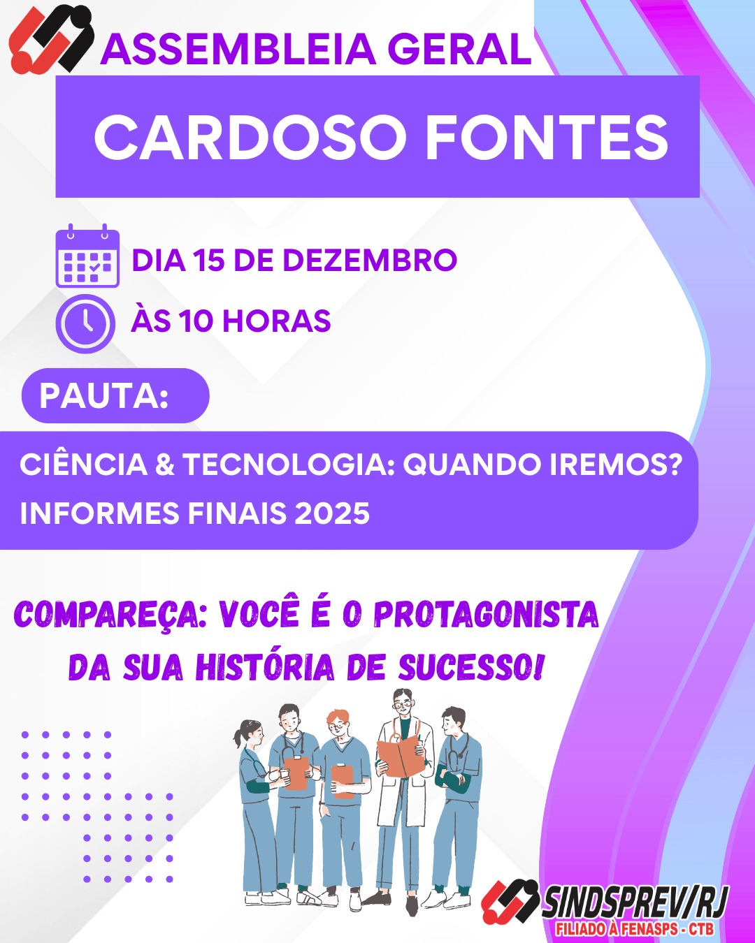 Se você é servidor(a) lotado no Hospital Cardoso Fontes, não deixe de comparecer à assembleia da próxima segunda-feira (15/12).
