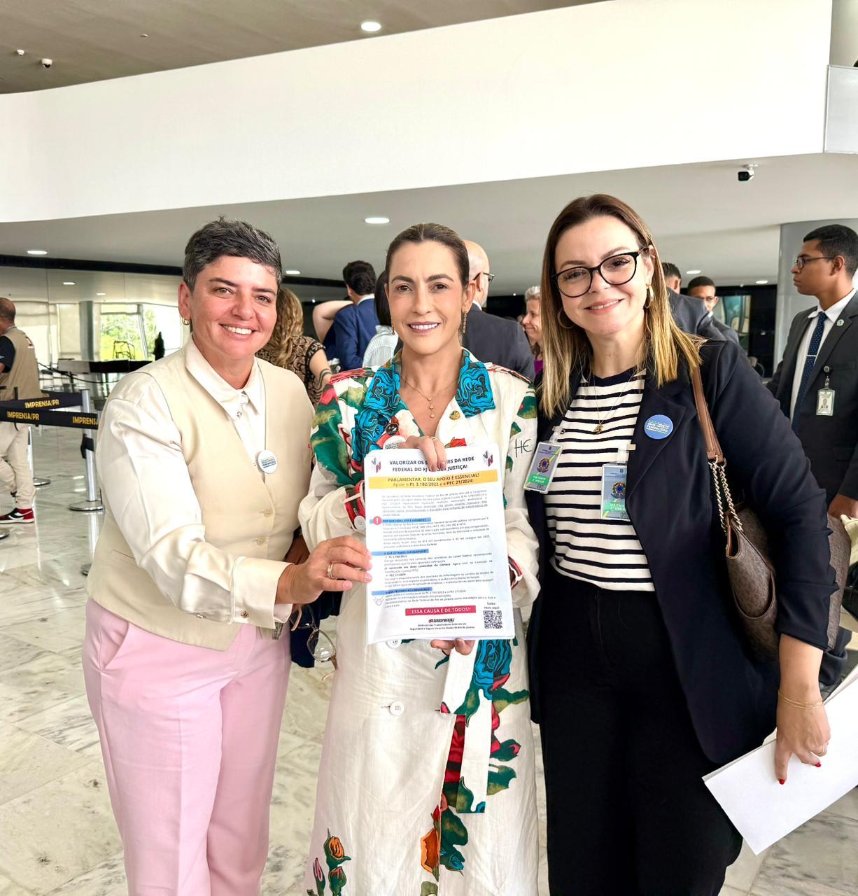 O ato foi parte do lançamento do Pacto Nacional contra o Feminicídio, no Palácio do Planalto, quando dirigentes do Sindsprev-RJ também conversaram com a senadora Soraya Thronicke (Podemos-MS) sobre o PL 3.102. Em resposta, a senadora se comprometeu a reforçar, junto ao presidente Davi Alcolumbre, a importância de dar celeridade ao texto.