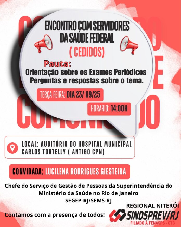O Sindsprev/RJ – Regional Niterói convida os servidores da Saúde Federal (cedidos), para palestra com Lucilena Rodrigues Giesteira, chefe do Serviço de Gestão de Pessoas da Superintendência do Ministério da Saúde no Rio de Janeiro (Segep-RJ/SEMS-RJ), no próximo dia 23, às 14h, no Auditório do Hospital Municipal Carlos Tortelly, antigo CPN. A importância e a orientação sobre exames periódicos, com perguntas e respostas, serão temas do encontro.