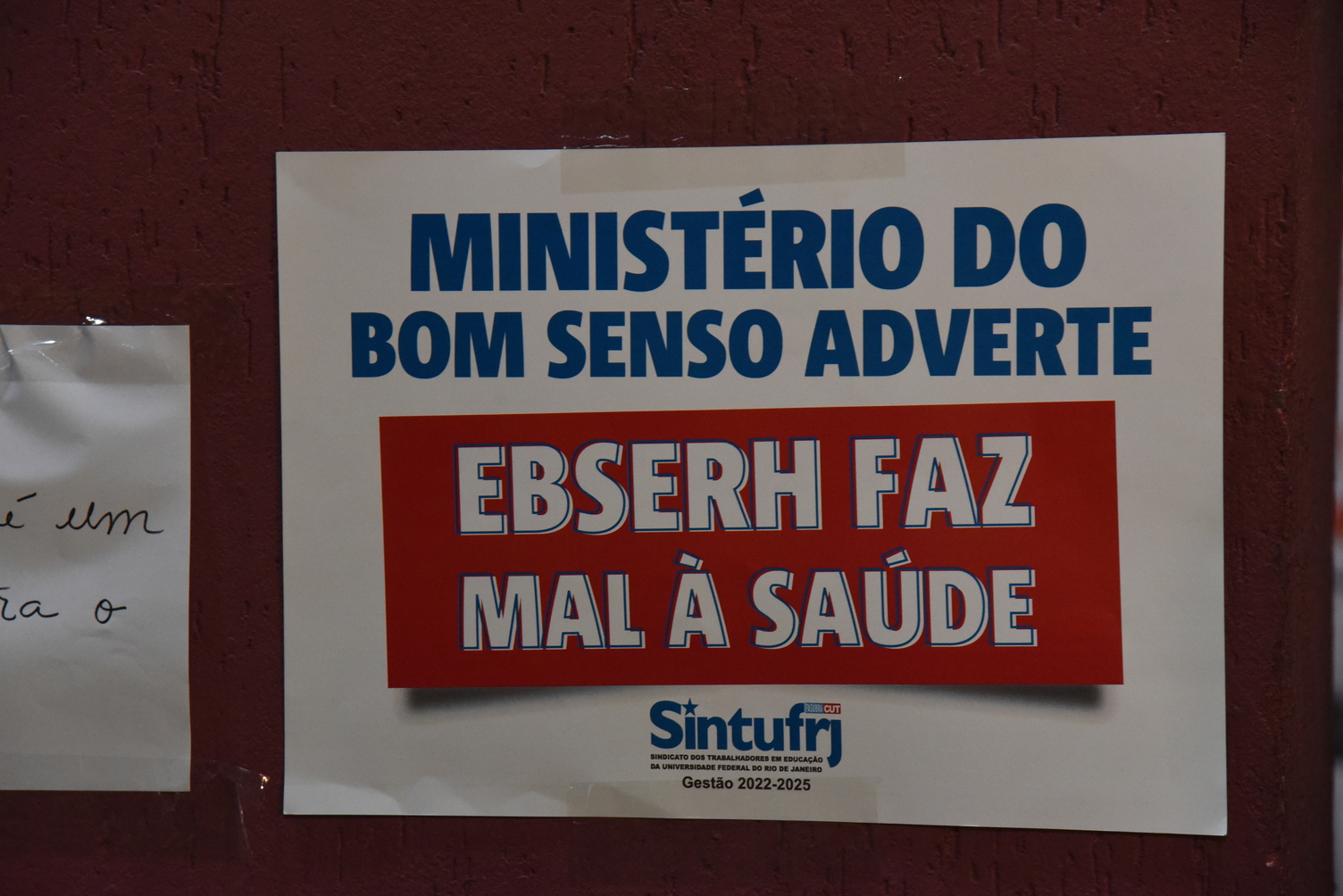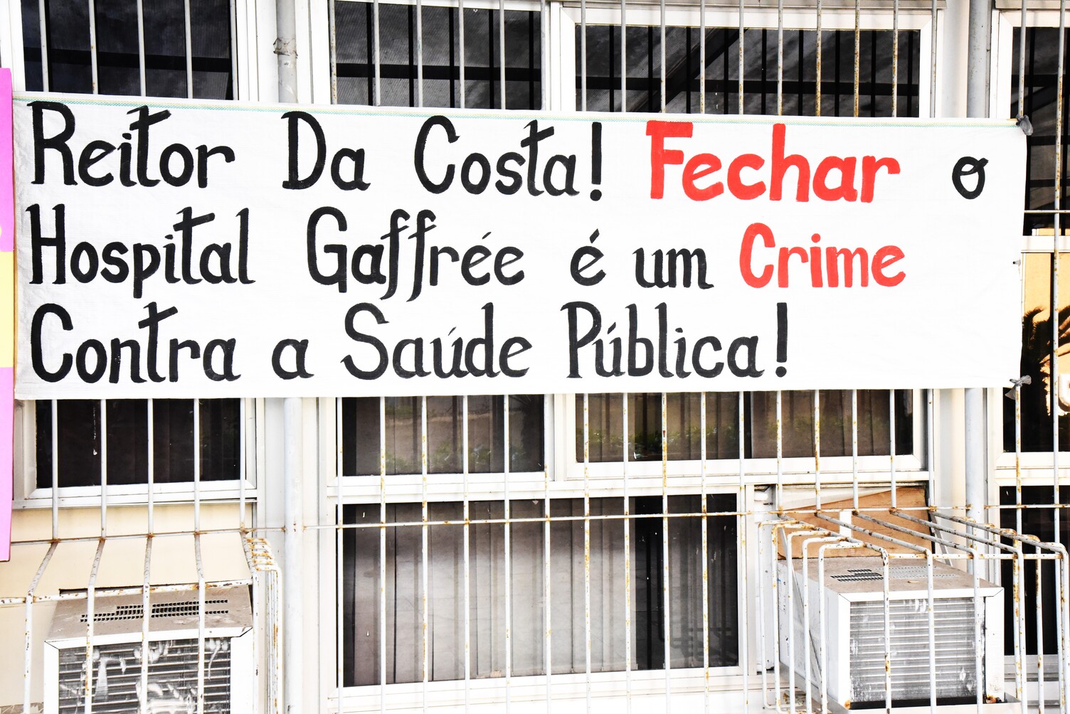Além da faixa levada contra o fatiamento, levada pelos servidores da rede federal, a sessão do Consuni foi tomada por vários cartazes com críticas à proposta de fusão e à gestão do reitor José da Costa. “Reitor da Costa. Fechar o HUGG é um crime contra a saúde pública!”; “Conselho sem legitimidade: comissionados não eleitos votam pelos interesses da Reitoria!”; “Exigimos que o reitor Da Costa realize plebiscito sobre a fusão do HUGG” e “Por uma universidade 100% estatal” foram alguns dos dizeres.